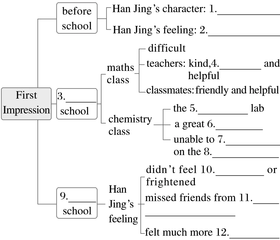 Han Jing is a senior high school student now.On the first day,she felt anxious and was not sure if she could make a good first 1.____________(impress).Her first maths class was very difficult.The teacher,kind and 2.__________(friend),told them a funny story,3.____________(make) the students laugh.However,in the chemistry class,a guy tried to talk to her the whole time,4.____________ made her not concentrate 5.____________ the experiment.She just wanted the guy to be quiet and leave 6.____________(she) alone.After the first day,Han Jing had a different opinion about the life at senior high.She didn’t feel awkward or 7.____________(frighten) at all.Though she missed her former friends,she believed she 8.____________(make) new ones.She felt much 9.____________(confident) than that morning and even thought the next day would be 10.____________ great day!