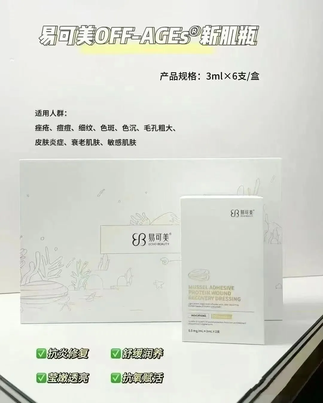 产品规格:3ml×6支/盒贻贝粘蛋白浓度:0.5ml/支