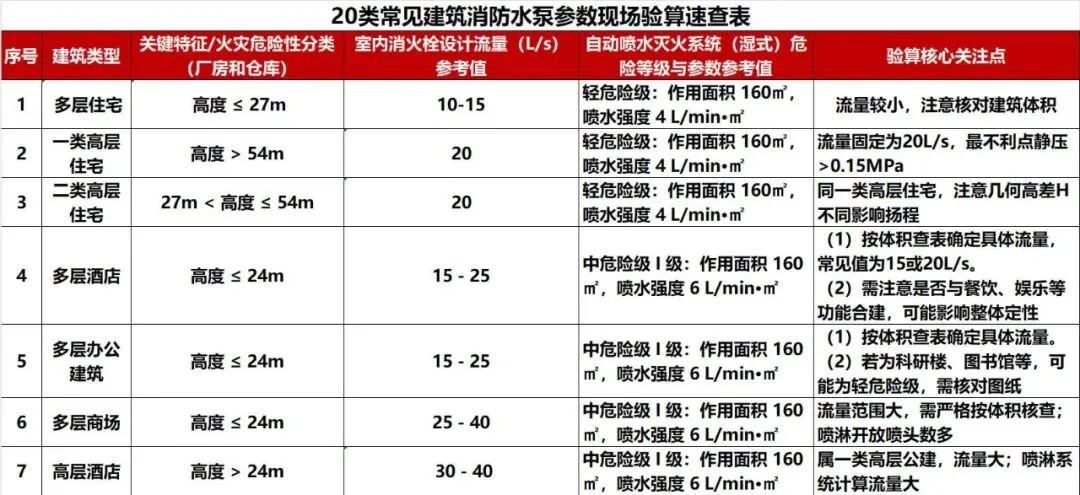 在日常工作中,时常会遇到需要在现场对不同建筑、不同消防水泵参数进行验算的情况,本文将常见的20类建筑的灭火水系统消防水泵验算涉及的参数进行了整理,并对验算流程进行了总结,以作参考。