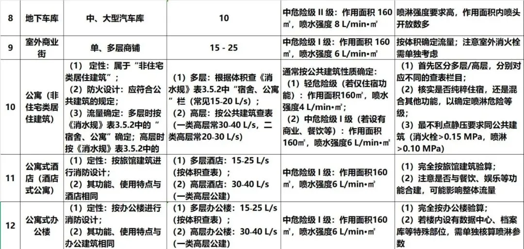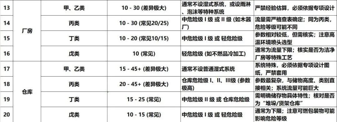 对照下表,根据建筑类型、高度、体积(工业建筑加火灾危险性、储物高度)核对设计参数。