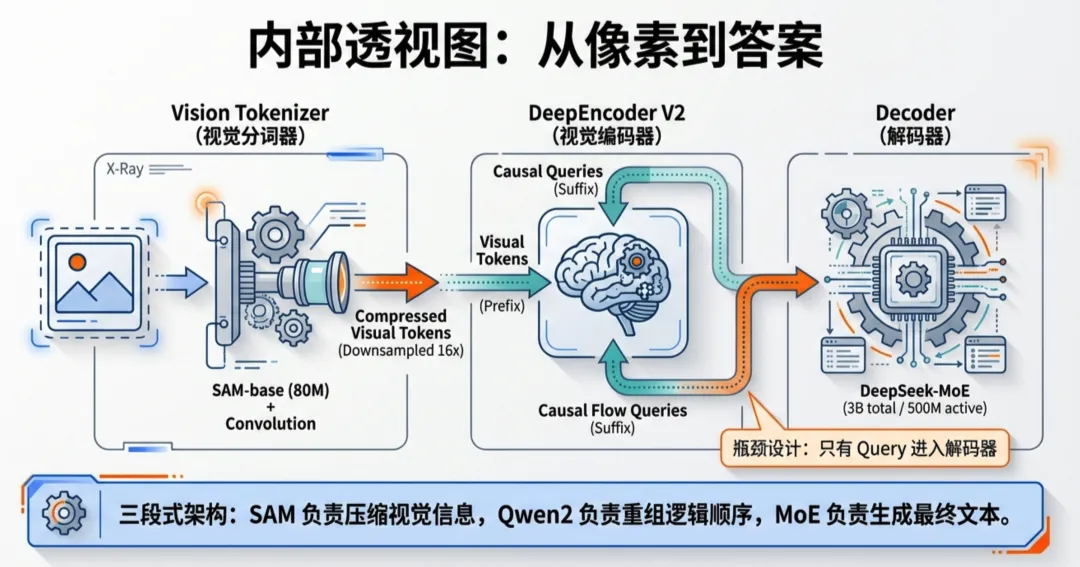 DeepSeek-OCR 2 延续了“编码器-解码器”的整体框架,但内部大有乾坤: