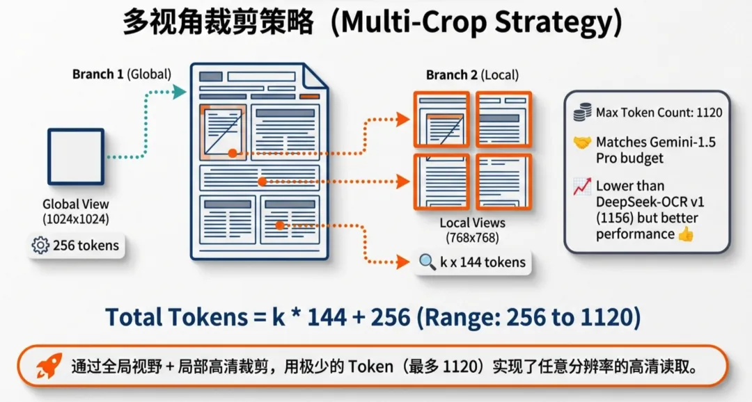 - 2. LLM 式视觉编码器: 这是一个 0.5B 参数的语言模型架构。它通过“多视窗策略(Multi-crop)”处理图像,利用学到的 Query 将杂乱的像素信息整理成有序的“视觉叙事”。