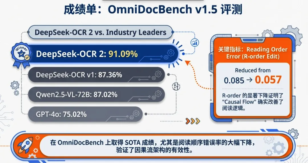 在权威榜单 OmniDocBench v1.5 上,DeepSeek-OCR 2 展现了统治力: