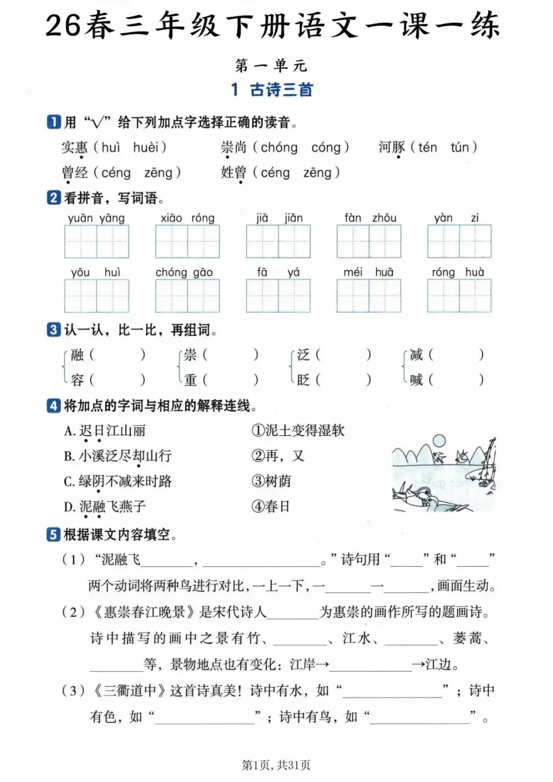 学习资料 | 2026春语文1-6年级下册【一课一练】含答案,高清电子版,可直接下载