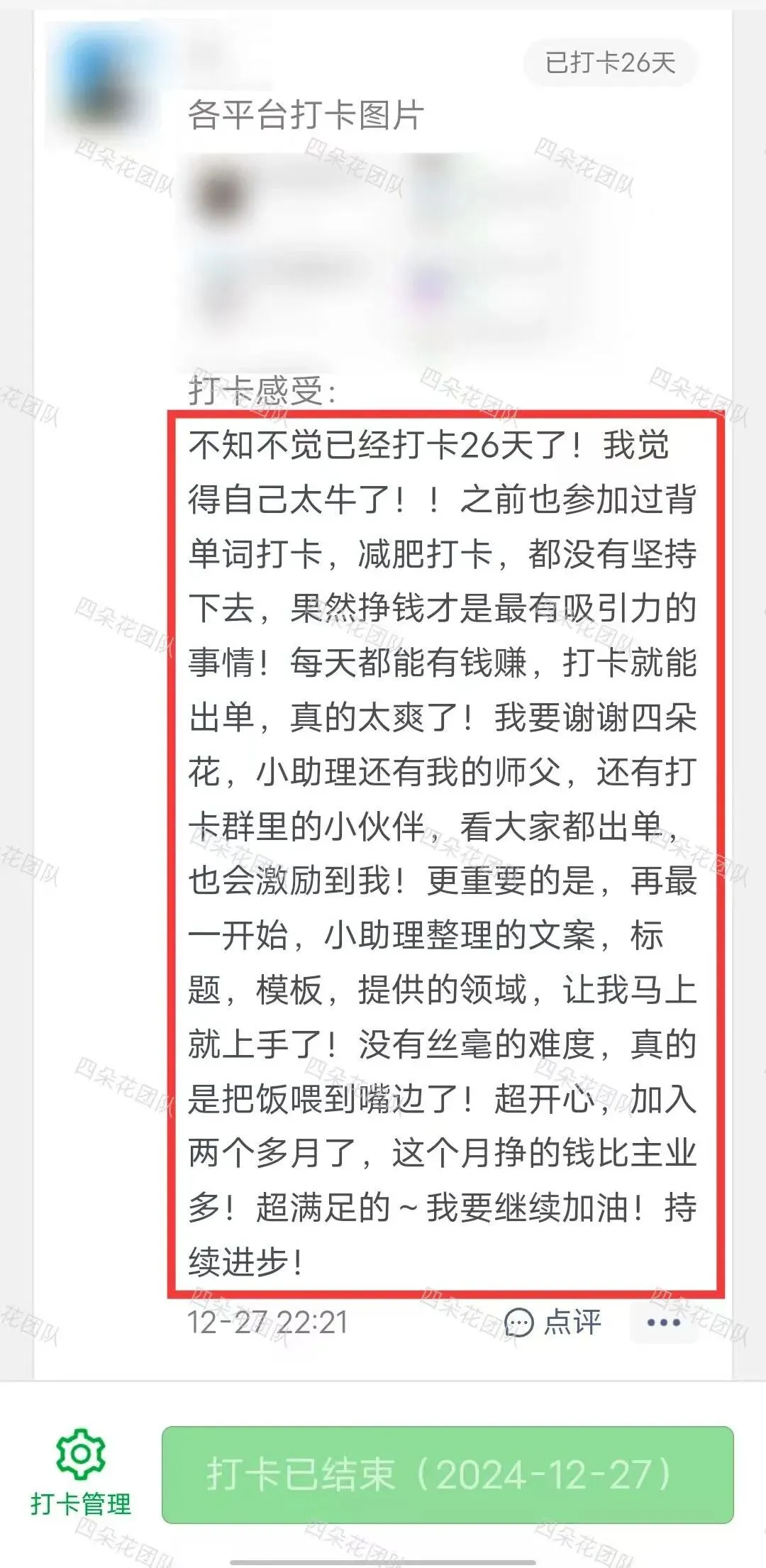 “不知不觉已经打卡26天了!我觉得自己太牛了!之前也参加过背单词打卡,减肥打卡,都没有坚持下去,果然挣钱才是最有吸引力的!在四朵花团队,每天都能有钱赚,打卡就能出单,真的太爽了!”