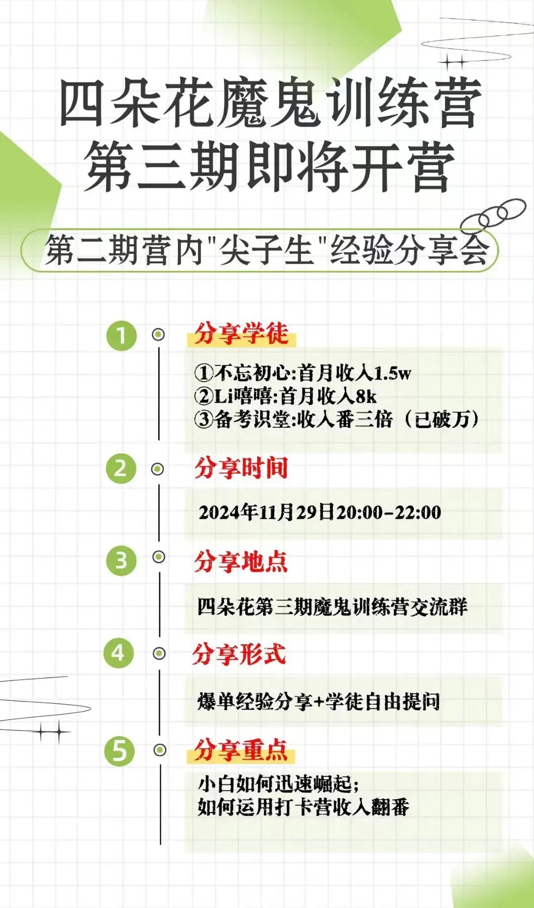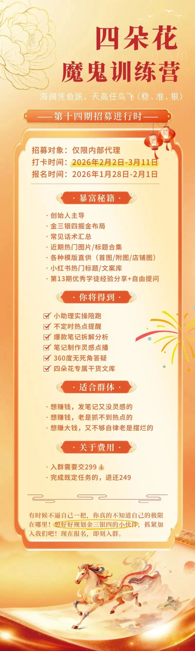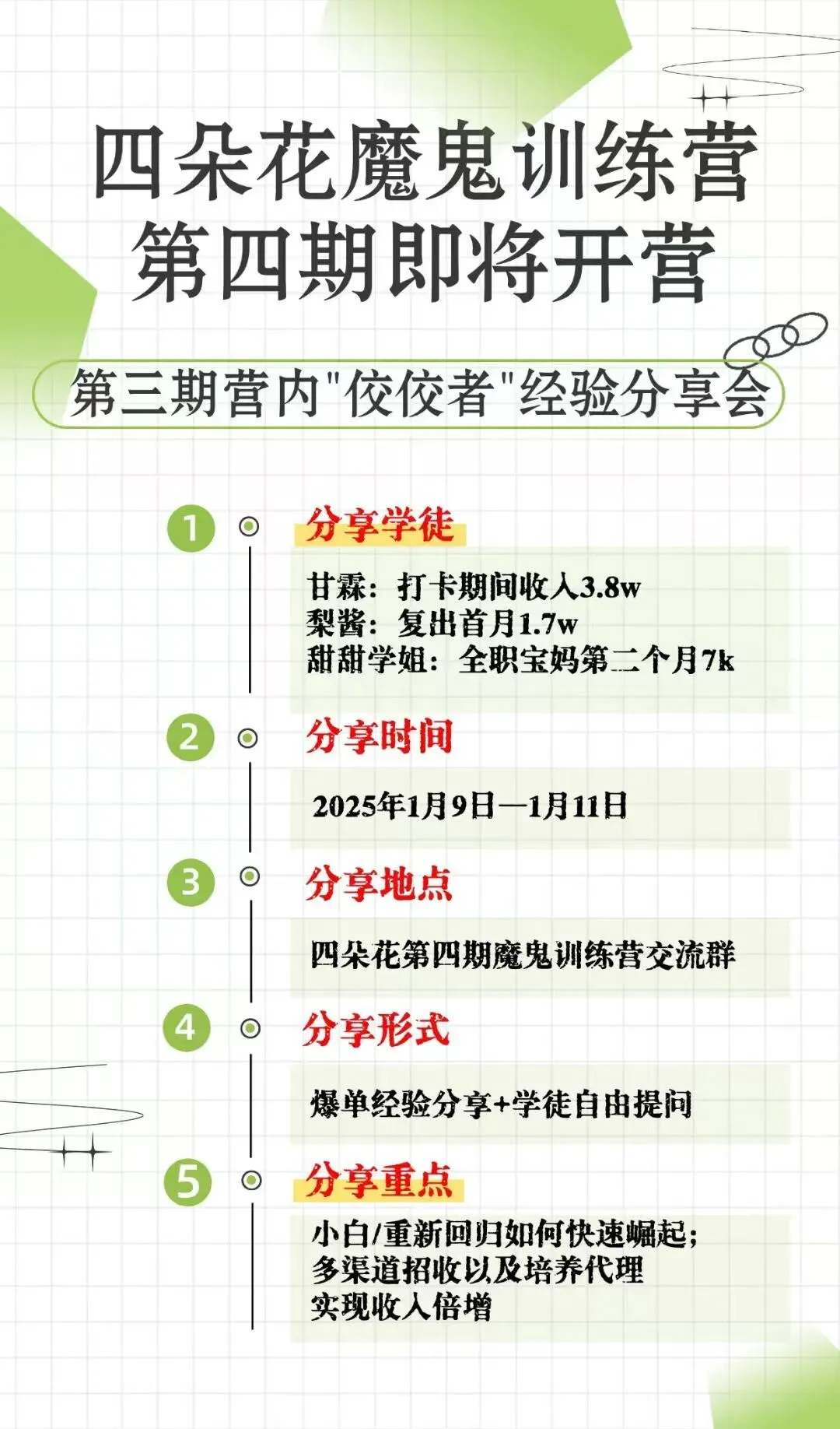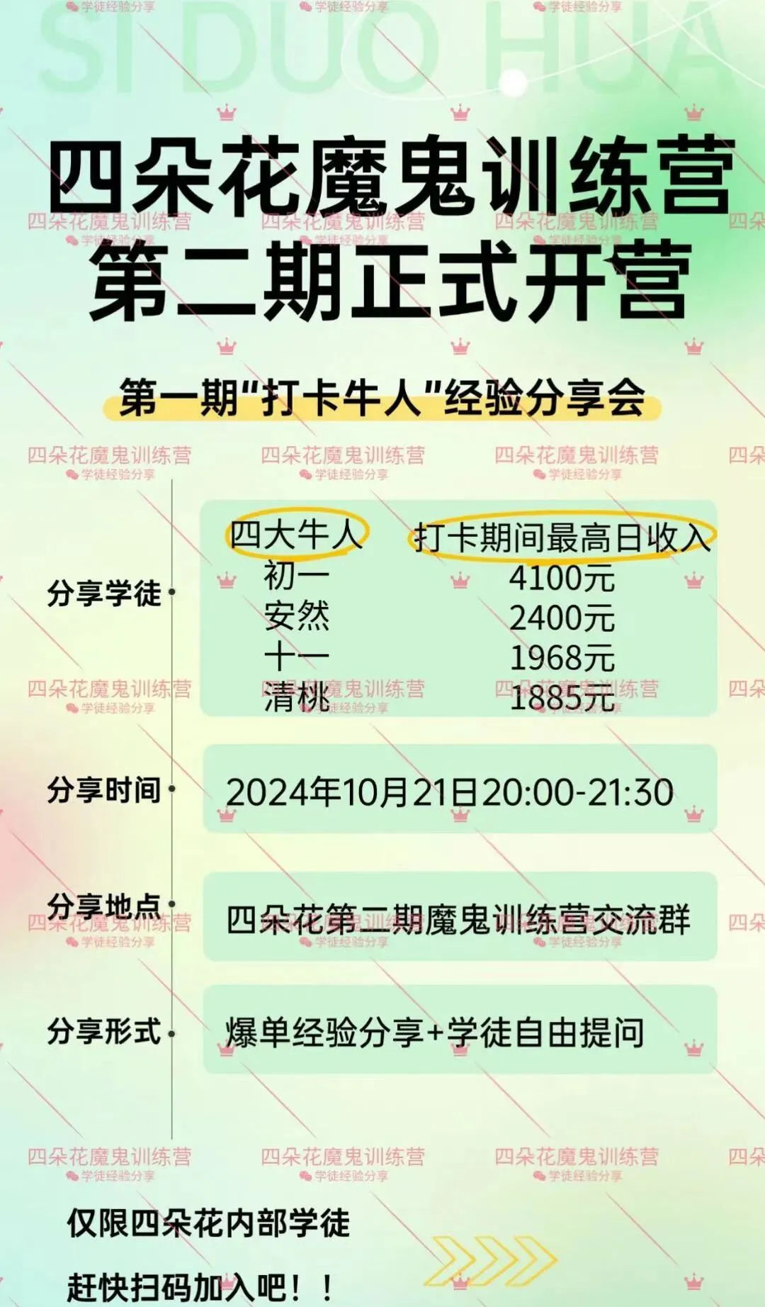 四朵花魔鬼训练营,之所以能让无数0基础小白快速逆袭、老代理突破瓶颈,核心就一个——我们不玩虚的,只做实事,手把手带你解锁流量变现密码!