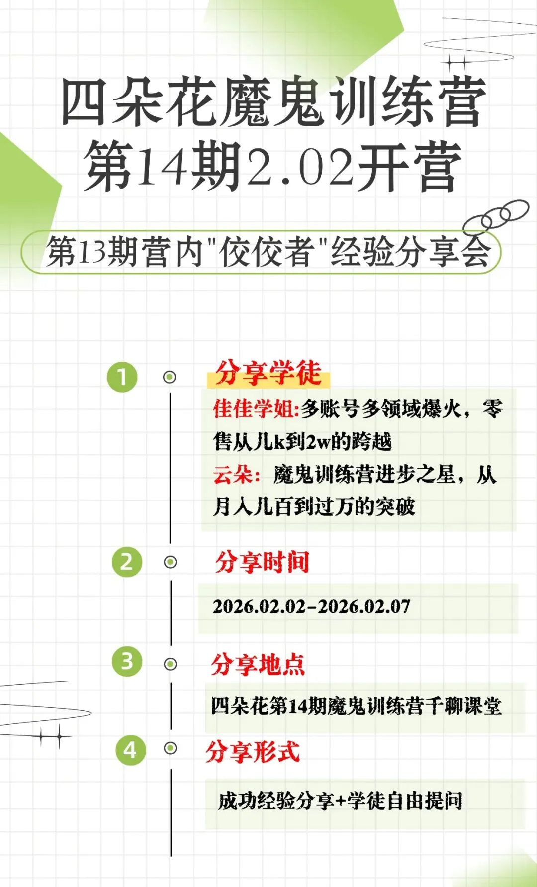 机会不等人,风口不等人!当下,四朵花第十四期魔鬼训练营,招募正在火热进行中,错过这一期,就只能等3月底,到时候“金三银四”的黄金旺季,只能眼睁睁看着从身边溜走了。