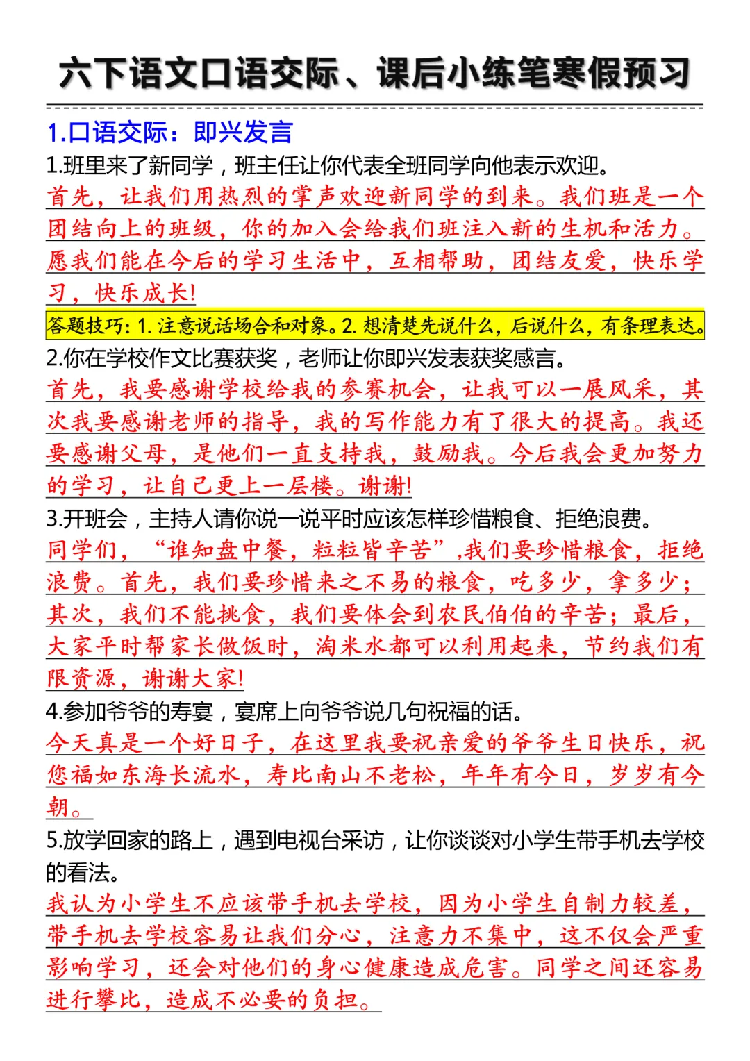 六下语文(口语交际、课后小练笔)寒假预习学习资料~