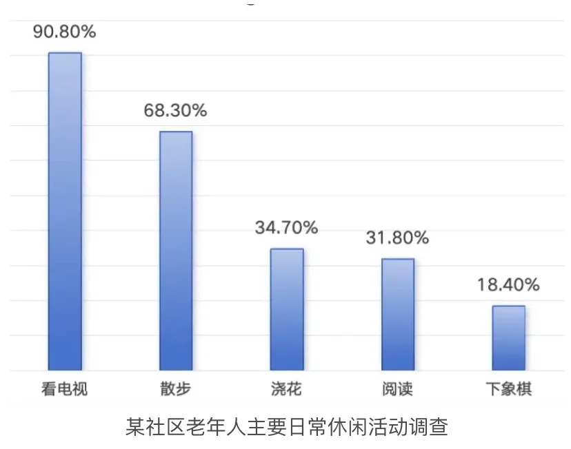 The bar chart shows a survey in terms of proportions of old people choosing different recreational activities in a certain community. Those who like to watch TV take the lion's share (90.80%) , whereas only a small portion of the aged (18.40%) opt to play chess. The shares are 68.30%, 34.70%, 31.80% in having a walk, watering flowers and reading respectively.(第一句的惯用格式The bar chart shows+翻译图表的中文标题,接下来分别具体地描述一下图表数据)