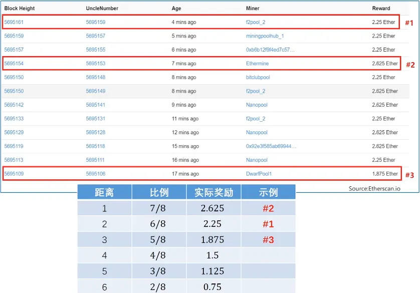 图中倒数第二行就是该uncle reward,根据与这个区块的距离(括号中),决定该获得x/8的奖励