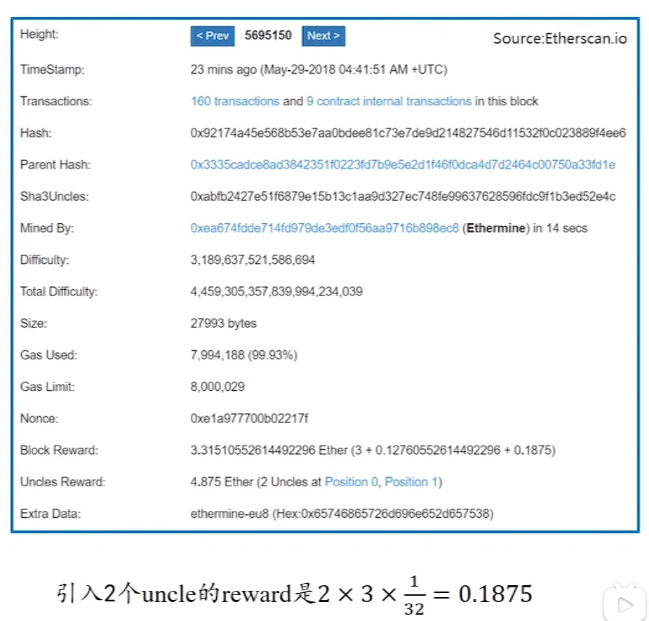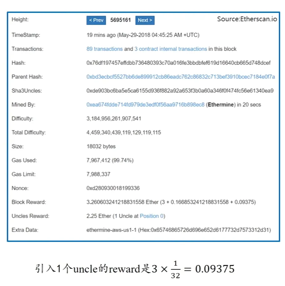 图中倒数第三行就是区块奖励,由括号中3部分组成,分别是:固定区块奖励3ETH,gas fee和因包含uncle而得到的奖励
