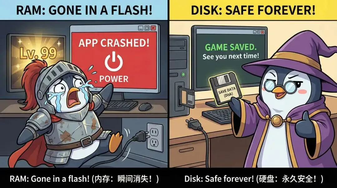 瓜瓜:“冷静。你昨晚只是把数据存在了内存里。 内存是‘易失性’的,程序一关就清空。