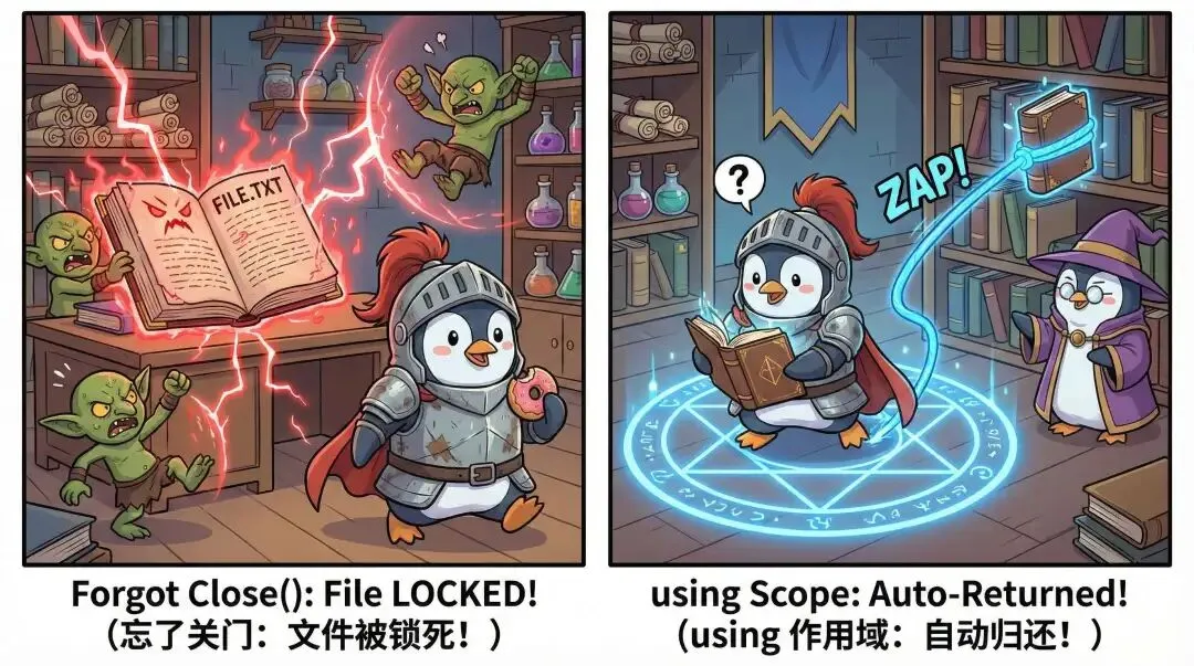 using (StreamWriter sw = new StreamWriter("log.txt", true)){ sw.WriteLine("第一行日志"); sw.WriteLine("第二行日志");// 写了一万行……}// 👈 出了这个大括号// C# 自动帮你 Close() + Dispose()// 即使中途报错,也一定会关门