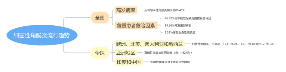 1.发病率:多数研究常将感染性角膜炎、角膜盲作为诊断条目进行流行病学统计,因此难以准确估计细菌性角膜炎的流行病学数据。(笔记:多数流行病学调查关注整体感染性角膜炎或角膜盲,而非细分病因,细菌性角膜炎属于感染性角膜炎,因此说难以估算)