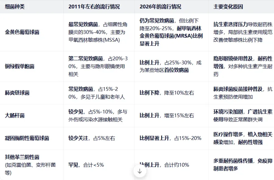 问:全球近半个世纪细菌性角膜炎的主要致病菌发生怎么样的变迁?以及原因是什么?