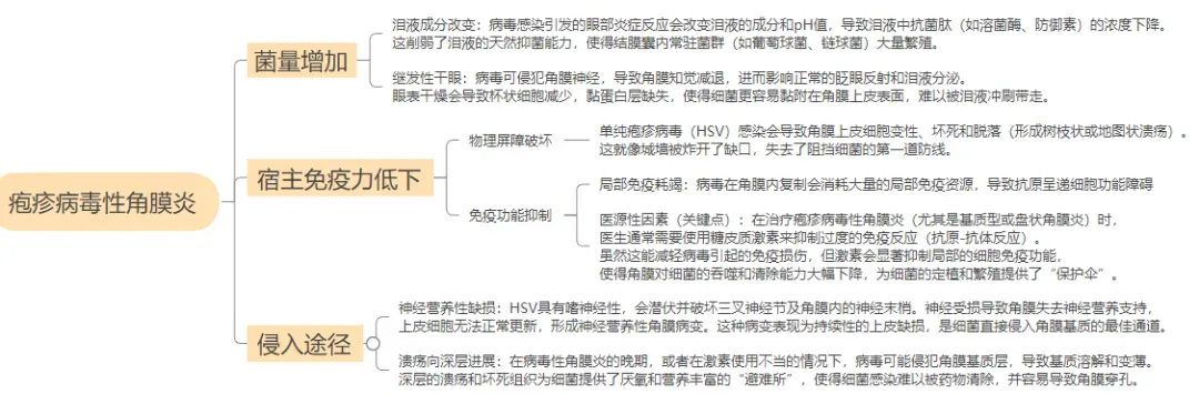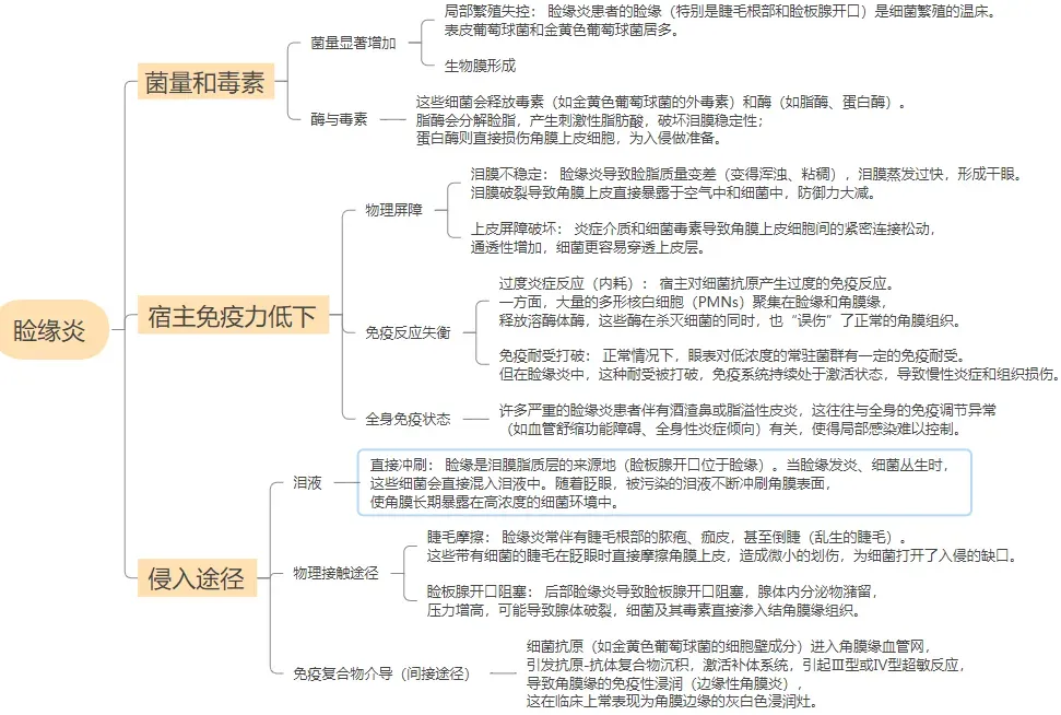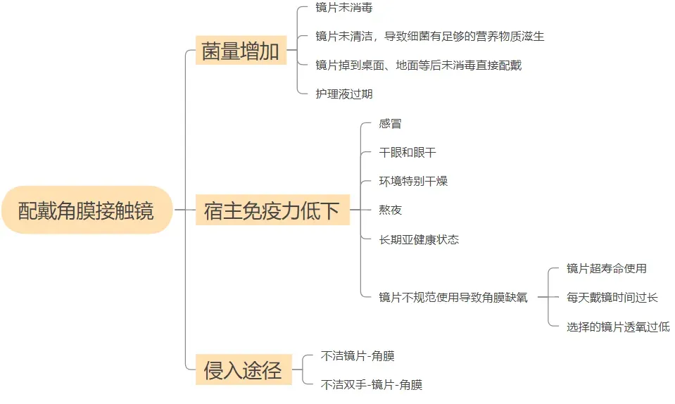 原文:3.危险因素:细菌性角膜炎常见的危险因素分为局部因素和全身因素。主要局部因素包括配戴角膜接触镜、眼外伤、手术及眼表疾病等,其他局部因素包括干眼、睑缘炎、倒睫、睑内翻、眼睑闭合不全、疱疹病毒性角膜炎、泪囊炎等。主要全身因素包括糖尿病、使用免疫抑制剂以及免疫缺陷性疾病等。(笔记:细菌性角膜炎的发病有三个重要因素:特定的侵入途径、足够的菌量、宿主的免疫低下。我们从这三个角度逐个分析这些危险因素对细菌性角膜炎的影响)