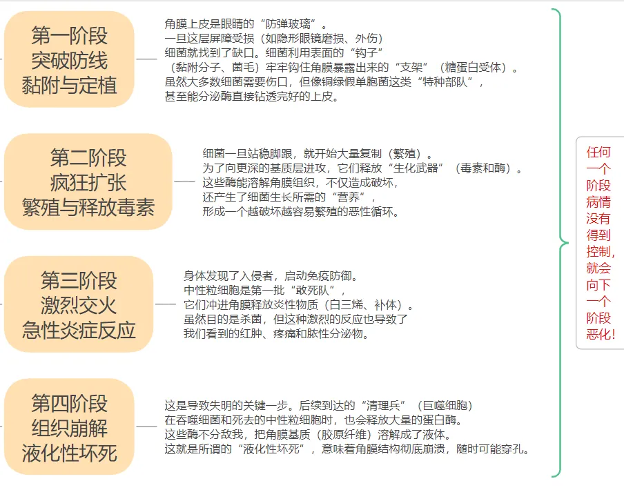 问:这段文字比较难懂,通俗概括细菌性角膜炎的发病过程: