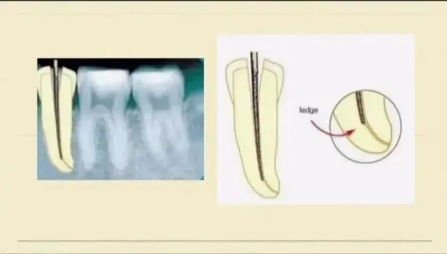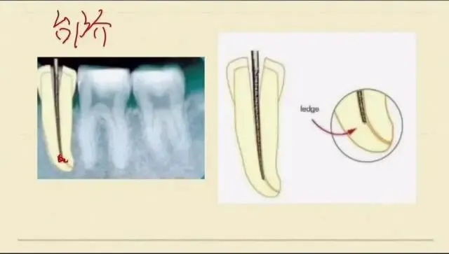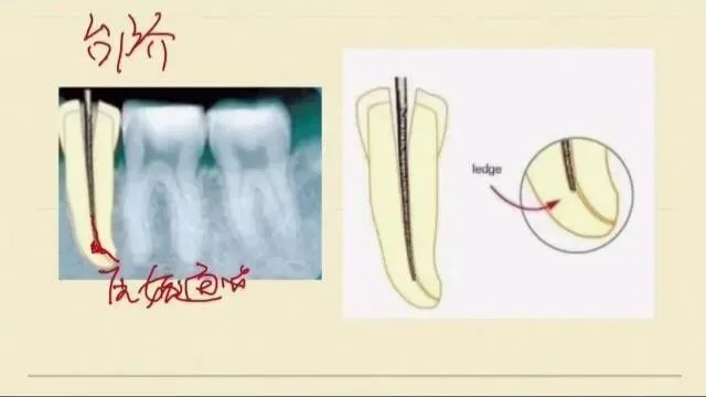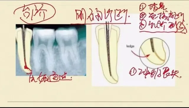 今天跟大家分享根管台阶。在我们的根管疏通预备的过程中,我们会人为的形成一个凹坑状不平的结构,让我们的根管锉很难进入到根管的原始通道,这样就形成了台阶。遇到这样的台阶时候,我们首先要能够明确诊断:什么情况下是形成了台阶,我们在根管预备疏通的过程中,如果发现根管工作长度的丧失,可能是根管的堵塞、器械的离断,台阶的形成。无论是哪一个原因,我们都要再次去疏通根管。