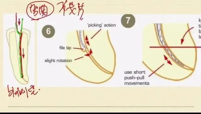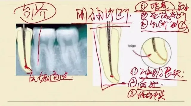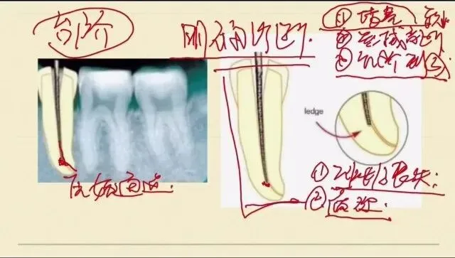 如果我们进行了预弯之后,我们的锉进入滑到将近台阶的这个位置,我们不是一个点点接触,而是一个面去接触台阶的位置,就很有可能划过去,通过这个台阶进入到根管的一个原始的通道,所以说这个是我提醒大家的一个技巧,锉进入后我们怎么去绕过台阶呢?