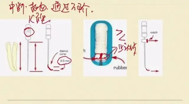 首先我们需要选择一个小号的 k锉,就是我们10号的k锉,我们选择一个10号的k错锉,然后我们对它k错的尖端的2~3个毫米进行一个预弯。进行一个预弯,同时要用我们的橡胶的止动片去标记预弯的方向,就是止动片上都有一个黑色的痕迹,或者是一个三角的凸起或者凹陷。去标记方向。
