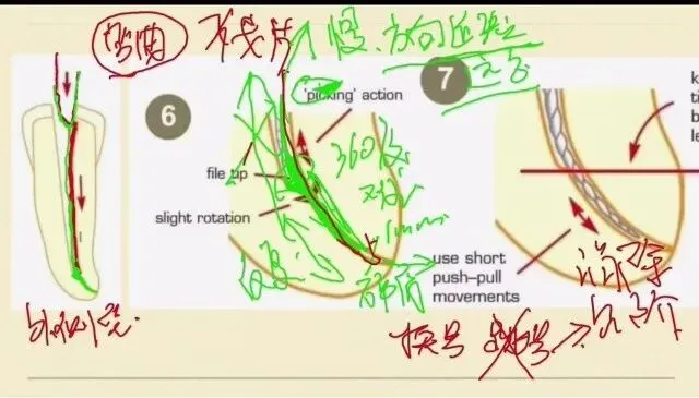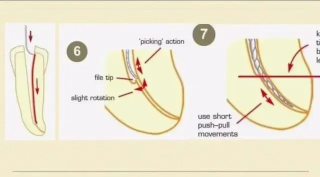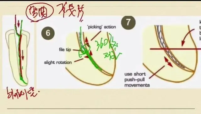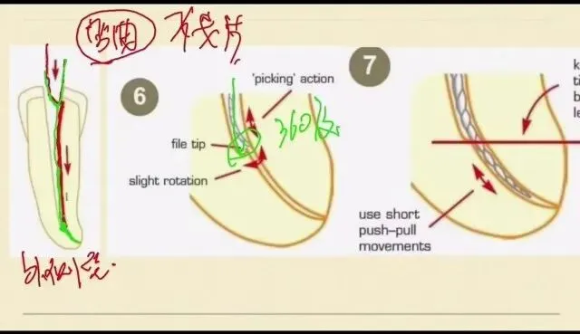 这个时候我们要进行一个360度的旋转去找方向,看看在哪一个方向360度的小幅度的这样的一个旋转,逐步的慢慢的去找这样的一个方向,很有可能在无意间这个方向通过了台阶,这个是最难的一步,但是这也不能着急,要静下心来,我们360度的旋转去找这样的一个方向,让我们的锉能够划过台阶,然后进入到根管的原始的通道。