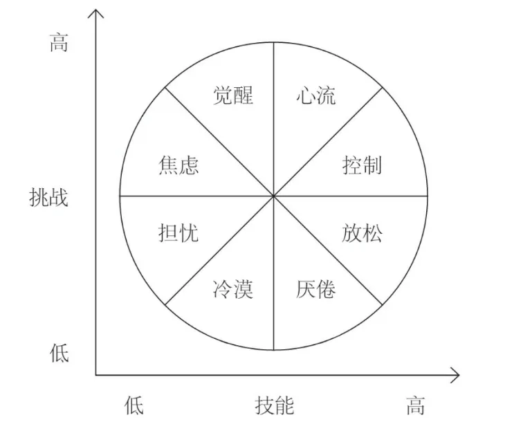 心流这么厉害,这么棒,那我们是不是随时就能进入心流渠道了?很不好意思,比较难!大家回想一下,最近一次体验“时光飞逝之快乐”和“人生巅峰之充实”的记忆是什么时候,是解决了一道别人都无法解决的数学题的学生时代?还是通宵熬夜编写毕业论文的毕业前夕?是草拟完美无缺的合同而获得客户称赞时光?还是做精美的PPT而拿下大客户的高光时刻……人类的“最优体验”还是比较稀缺的,需要在技能和挑战两个维度的夹缝中寻找 。按照技能、挑战两个维度,我们可以将人们的常见行为模式总结下图所示的八种。心流正是处于心流渠道内。