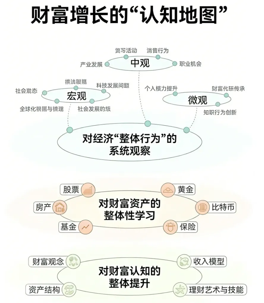 这张图是一份财富增长的“认知地图”,它从系统认知、资产学习、认知提升三个层面,构建了一套完整的财富增长底层逻辑。1. 对经济 “整体行为” 的系统观察