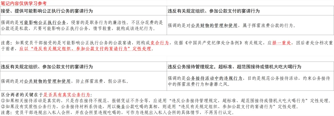 【注意】如果党员干部接受的是可能影响公正执行公务的公款宴请,则构成竞合行为,依据《中国共产党纪律处分条例》有关规定,应择一重处,因后者处分档次重于前者,应以“违反有关规定组织、参加公款支付的宴请行为”定性处理。