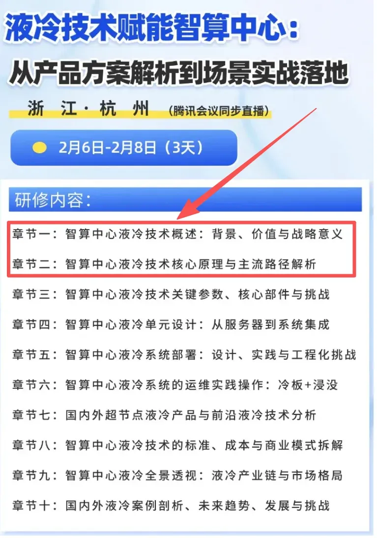 主要指标有燃点、闪点、倾点、运动粘度、比热容、导电率、介电常数、电阻率等等,下图是以水为参照,把主流的油类和氟化液方案做了对比;可以看到全球液冷市场依然是北美地区占比大,起步早,主要玩家有openAI、Meta、微软、亚马逊这类AI公司、IT公司占主导,采用冷板方案为主,国内市场占全球份额约10%,主要玩家是头部互联网大厂和运营商,26年国内预计液冷将会迎来爆发,在全球的占比会提升。最近(2.6-2.8共三天)老张受邀作为讲师之一去参与一个“液冷智算中心”主题的培训,其中的两个章节(对应下图中的前两章)是我讲,后面章节是淼算科技的赵总讲解(他在液冷领域非常资深,有多年的实战经验),对课程感兴趣的可以加我vx17603229978咨询;另外,4月份老张受邀作为嘉宾之一,参加一个液冷峰会活动的主题演讲,活动很有影响力,做液冷相关领域的朋友可以了解一下!