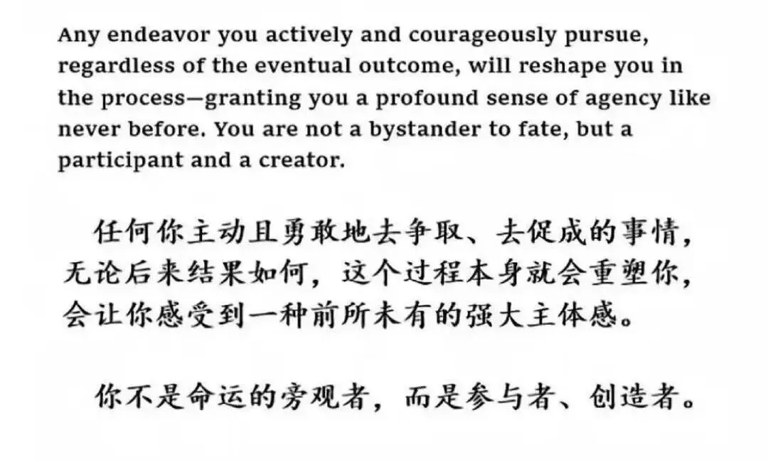 对于我生命中做过的每一件事,每一个选择,我都不后悔。但我常常为之感到后悔的是那些我没做过的事、没选的那个选项。我们大部分时间都在害怕失败,害怕拒绝。但是后悔才是我们最该害怕的事。失败是一种答案。拒绝也是一种答案。但后悔却是你永远得不到答案的永恒问题。“要是我当初……”“如果我那样选了……”“不知道如果走了那条路会怎样……”你永远、永远都不会知道答案,而且这些疑问会纠缠你一辈子。