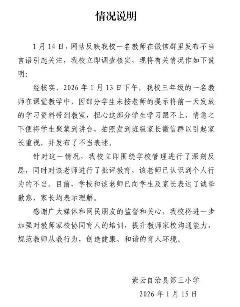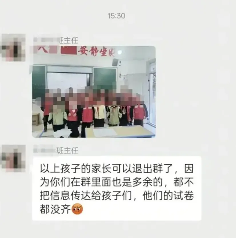 近日,贵州省某小学三年级,部分学生没有提前把学习资料带到教室,老师把这些学生的照片放到家长微信群里,并说,以上孩子的家长可以退出群了,因为你们在群里面也是多余的......。针对此事,有网友向学校反映,学校调查核实后,对老师进行了批评教育,该老师已经认识到个人行为的不当,学校和老师已向学生及家长表达的歉意,家长均表示理解。老师把孩子们的尊严踩在脚下,在家长群公开照片,还对家长说这样的话老师训斥训习惯了,地位高高在上,对家长也这样说话!有些家长意见比较中和,老师可能“太难了”,家长不配合。我们说,家长和老师之间,什么时候关系变得这么脆弱了呢?我们先说说老师的做法,这种做法让“退群”威胁家长的做法,显然是不明智的,家长感觉有一种被“训斥”的感觉,这样让问题情绪化,反而激化矛盾。明显这位教师在微信群说这样的话,属于失态的行为。但我们也要理解老师的做法,很多老师非常辛苦,尤其是初中高中老师。老师也有家庭,也有孩子要辅导,当看到孩子们没有按时提交资料时,一时生气。还有家长说,凭什么我们家长要每天盯着微信群呢?孩子没有带作业,为什么一定老师要怪罪我们家长呢?那我们说,针对家长微信群,老师在微信群里布置任务,是否家长有责任督促?一个妈妈在评论区说,我家孩子以前也因为没有带作业被罚站过,每天早晨6:30分起床,给孩子做饭,晚上经常加班,孩子爸爸也出差,我们单位的工作很忙,基本上没有看手机的时间,所以老师在群里发的信息,我经常看不到,等我看到这个的时候,孩子因为没有带资料被罚站了。另一个妈妈说,我也不想让孩子在全班面前丢脸啊,没有带资料这种情况很常见,老师也应该理解我们家长,而不是让我们“退群”。还有家长说,我每天都要看好几次班级的家长群,每次看到老师发来的消息,我都很认真的看,生怕漏掉什么消息,孩子第二天被老师责罚。这个事情,老师丢了面子,寒了心,家长伤了面子,丢了尊严,孩子被拍了照片,伤了自尊。但问题是什么?对于教育孩子,我们都是为了孩子,老师要做什么,家长要做什么?老师有责任心,家长看到了,但没有带作业这个事情,能不能换一种方思路,我们把作业统一放到学校教室某个地方,我们先讲别的课程,难道就不可以吗?我们把课程计划排的详细一点,让家长提前准备不可以?孩子们上学的时候,忘带东西很普遍,我家孩子忘带红领巾、水壶、铅笔盒、作业本,这种情况很多,其他家长说,我们家也是如此,尤其是小学阶段,经常忘了拿东西。而且,学生和老师之间,老师担任一个教育的角色,正确教育方法很重要,而不是训斥,罚站,甚至对学生的家长也这样说话。从这个方面说,老师可能有点情绪失控了,这件事处理存在问题的!我们家长也要经历多为老师想一想,老师也是普通人,也有情绪失控的时候,少一些苛责,多一点理解,毕竟,老师也是为了孩子。我们可以这么理解,她不是坏人,也许只是太累了。欢迎有娃的家长进入我们的学习资源交流群,职场、婚姻、教育、情感、生活,你想聊啥....