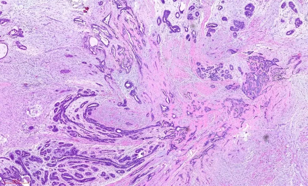 这是低倍镜下的一张图片,纤维结缔组织大量的增生→会挤压包裹其中的腺体→被挤压的腺体扭曲、变形、拉长。如下图:
