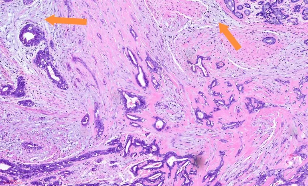 四、高倍镜下观察腺体一般都有完整的双层结构,即有腺上皮和肌上皮两种。但有些情况下是观察不到双层结构的,尤其是在术中冰冻时,这时候要警惕,即便是单排条索状排列,也有可能不是癌,是被纤维结缔组织挤压的结果,免疫组化可辨真伪。