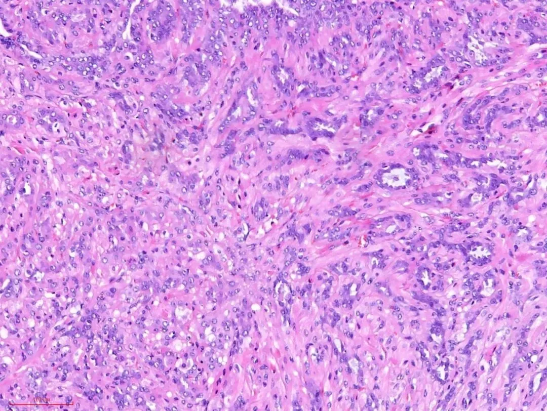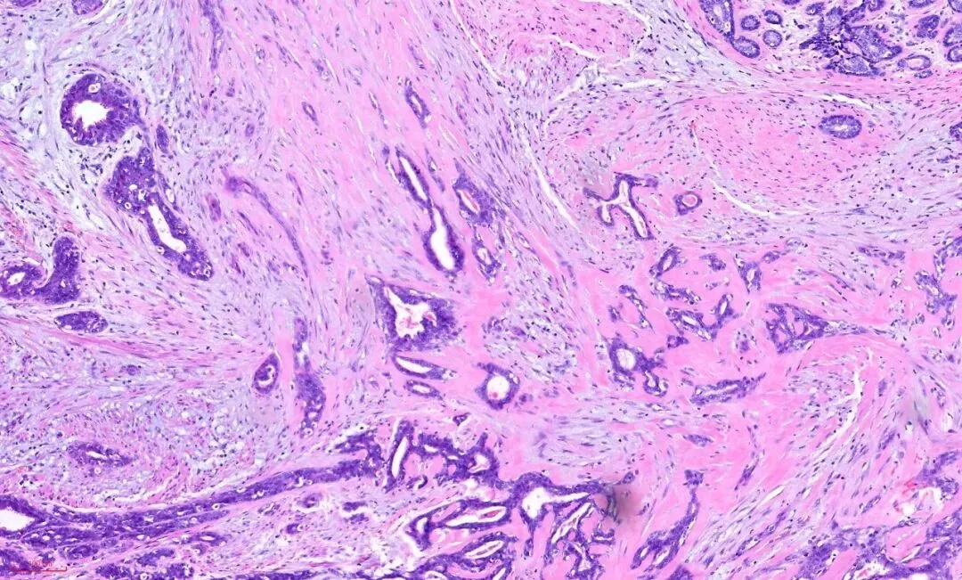 二、硬化性腺病:硬硬的间质挤压腺体变形,二者之间没有裂隙。硬硬的间质表现为大量透明变性的、致密的胶原纤维增生,通常缺乏显著的细胞异型性或炎性细胞浸润。