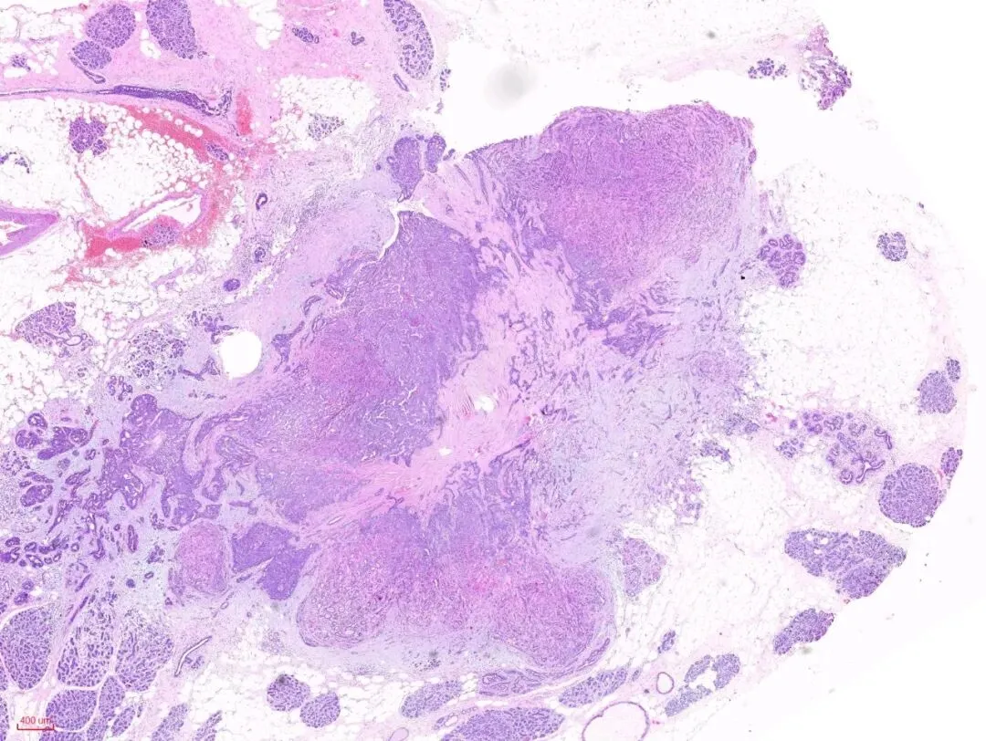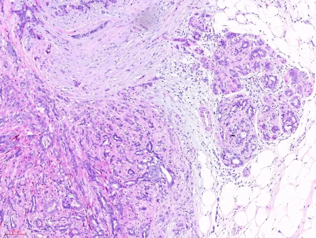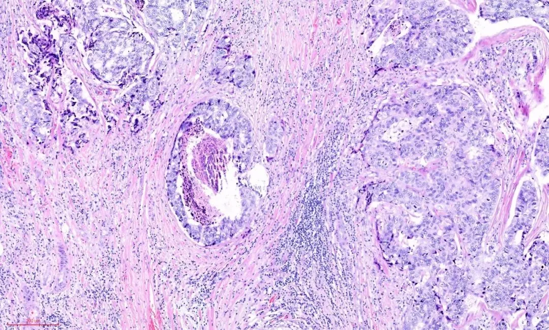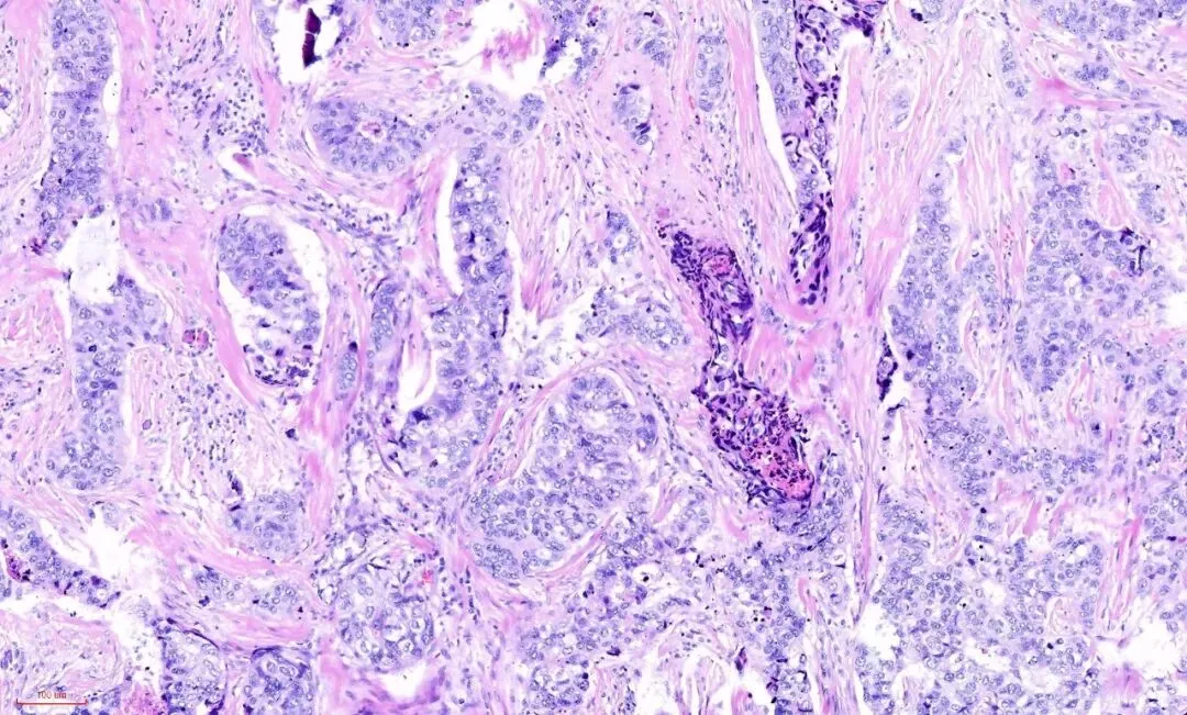 在没有粉染的硬化的间质旁边,似乎可以看到小叶的特化性间质。再观察腺体,可见到受挤压的腺体还保留着腺上皮(蓝染的)和肌上皮(粉染的或透明的)的双层结构。这是另一例,低倍镜下观察, 硬化型腺病的部分似乎保持小叶中心性的分布模式,病变周围是正常的小叶,如图:在视野中心看到粉染的硬化的纤维结缔组织,其内有受挤压变形的腺体,其周边有增生的腺体,如下图:左下角的这些腺上皮与右上角正常的腺上皮细胞是一样的,而左下角腺上皮周围的粉染的条索样的成分与右上角正常小叶的肌上皮成分是一样的,也就是说这部分应该是增生的腺上皮和肌上皮。免疫组化也证实了这一点。所以,即便是这样的杂乱无章,貌似癌的浸润,也还是良性的,这时应仔细观察细胞的异型性。如果是癌,细胞异型性是很大的,如下图:癌性的间质促纤维反应,也是粉染的,但不像硬化性腺病那样去挤压腺体,而是腺体与间质之间有一些裂隙,更大的区别在于细胞异型性,常有丰富的嗜酸性胞质,有不同的核级,核从规则到多形性,核大深染,核仁明显,核分裂象易见。如下图:如下图:可查见导管内癌的成分。而硬化性腺病则没有。 所以,诊断时,尤其是在术中冰冻诊断中,硬化性腺病是时刻需要与浸润性癌鉴别的。低倍镜下看结构,高倍镜下看细胞,需要用心体会,总结如下:一、首先在低倍镜下观察, 硬化性腺病的部分通常保持小叶中心性的分布模式,也就是说病变围绕在一个中心点周围。