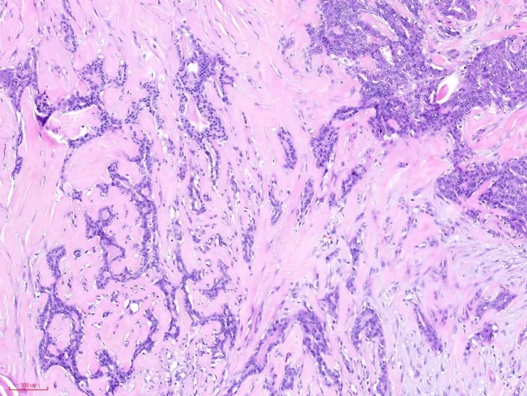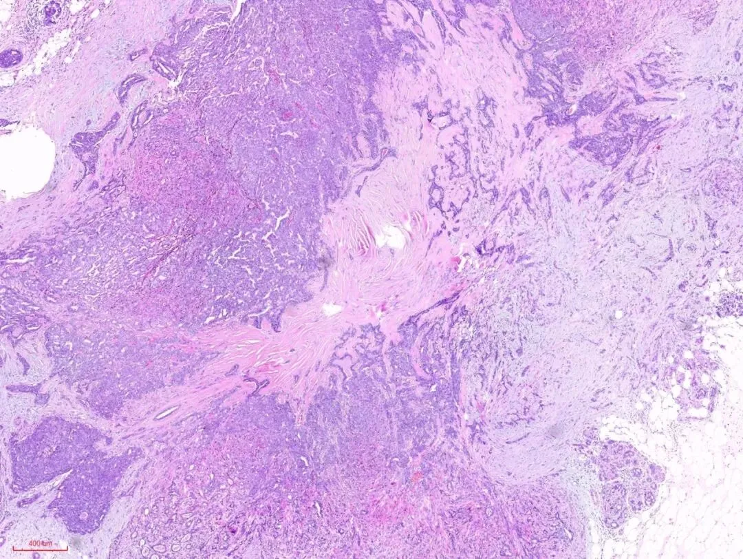 乳腺硬化性腺病是由于乳腺小叶内的腺体和间质过度紊乱的生长所致。所谓硬化是指致密的纤维结缔组织大量的增生,所谓腺病是指腺体的数量增多。纤维结缔组织大量的增生→会挤压包裹其中的腺体→被挤压的腺体扭曲、变形、拉长→腺体一般都有完整的双层结构(上皮和肌上皮),但有的甚至导致腺体的双层结构不好辨别→有的细胞呈条索状排列,在没有免疫组化支持的情况下很容易误诊为癌。那么究竟应该怎样更好的识别呢?