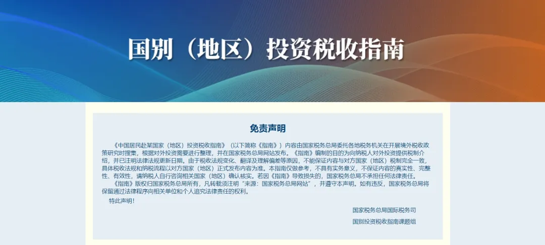 《中国居民赴某国家(地区)投资税收指南》(以下简称《指南》)内容由国家税务总局委托各地税务机关在开展境外税收政策研究时搜集,根据对外投资需要进行整理,并在国家税务总局网站发布。《指南》编制的目的为向纳税人对外投资提供税制介绍,并已注明法律法规更新日期。由于税收法规变化、翻译及理解偏差等原因,不能保证内容与对方国家(地区)税制完全一致,具体税收法规和纳税流程以对方国家(地区)正式发布内容为准。本指南仅做参考,不具有实务意义,不保证内容的真实性、完整性、有效性,请纳税人自行咨询相关国家(地区)确认核实。若因《指南》导致损失的,国家税务总局不承担任何法律责任。《指南》版权归国家税务总局所有,凡转载须注明“来源:国家税务总局网站”,并遵守本声明。如有违反,国家税务总局将保留通过法律程序向相关单位和个人追究法律责任的权利。
