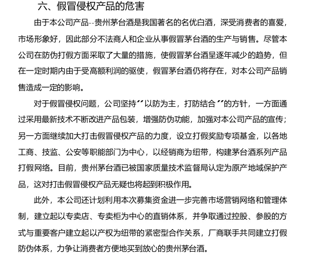同时贵州茅台酒已经被国家质量技术监督局认定为原产地域保护产品,而且会利用募集资金进一步完善市场营销网络和管理体制,建立起以专卖店、专买柜为中心的直销体系,并争取通过控股、参股的方法与重要客户建立起以产权为纽带的紧密型合作关系,厂商联手共同建立打假体系;这块一直在变化中,涉及利益相关方太多。