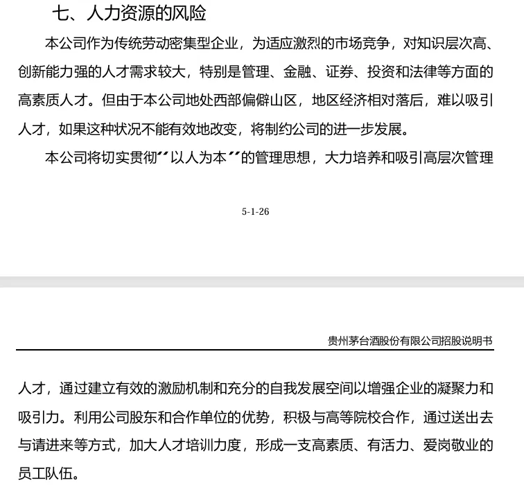 第七个风险因素(图2)是“人力资源的风险”,公司作为传统劳动密集型企业,为适应市场竞争,对知识层次高、创新能力强的人才需求较大,特别是管理、金融、证券、投资和法律等方面的高素质人才,但是本公司地处西部偏僻山区,地区经济相对落后,难以吸引人才,如果这种情况不能有效改变,将制约公司的进一步发展。