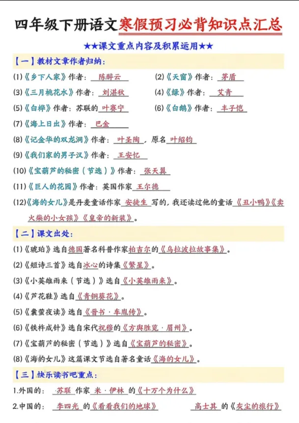 >学习资料库-2-2【26春1-6年级下册语文重点知识汇总-四年级下册】