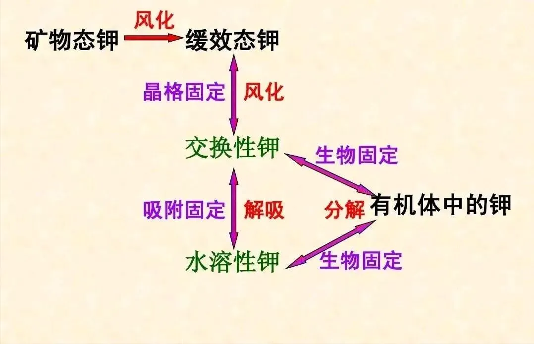 土壤中的钾包括3种形态:①矿物钾。主要存在于土壤粗粒部分(土是由石头风化而来,粗粒部分就好比未完全风华的石头),约占全钾的90%左右,植物极难吸收。②缓效性钾。约占全钾的2%~8%,是土壤速效性钾的主要供给。③速效性钾。速效性钾包含交换性钾和土壤溶液钾,指吸附于土壤胶体表面的代换性钾和土壤溶液中的钾离子。植物主要是吸收土壤溶液中的钾离子。当季植物的钾营养水平主要决定于土壤速效钾的含量。一般速效性钾含量仅占全钾的0.1%~2%,其含量除受耕作、施肥等影响外,还受土壤缓放性钾贮量和转化速率的控制。比如,动植物的残体与排泄物会增加钾含量,我们平时也会施钾肥,这些都是会提高土壤速效钾的含量,但是,同时,植物也会吸收钾,而且由于钾的移动性强,下雨或灌水后易随水流失,这样也会减少土壤速效钾的含量。一增一减,就是最终的土壤速效钾的含量。所以,我们可以把土壤中钾的转化归结为两方面,即速效钾的固定,缓效钾和矿物钾的释放。