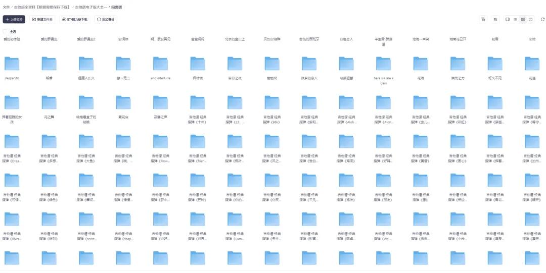 本资料为吉他学习专属资源合集,包含零基础入门到进阶的系统视频教程,多格式吉他谱集(含gtp、pdf、png格式及指弹谱),还有高清和弦指法图与音阶图。核心价值在于覆盖吉他学习全流程:从基础持琴、调音、和弦指法等入门知识,到各类曲目练习谱集,满足不同阶段学习需求。适用人群包括吉他初学者、进阶学习者及吉他爱好者,可助力学习者夯实基础、拓展曲目库,提升演奏能力。