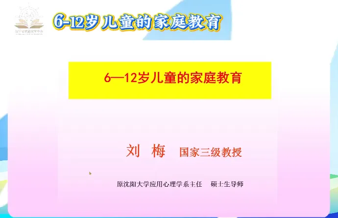 第十二课时 《6-12岁儿童的家庭教育》。主讲人辽宁省家庭教育学会理事、沈阳大学师范学院应用心理学系原主任、教授刘梅。