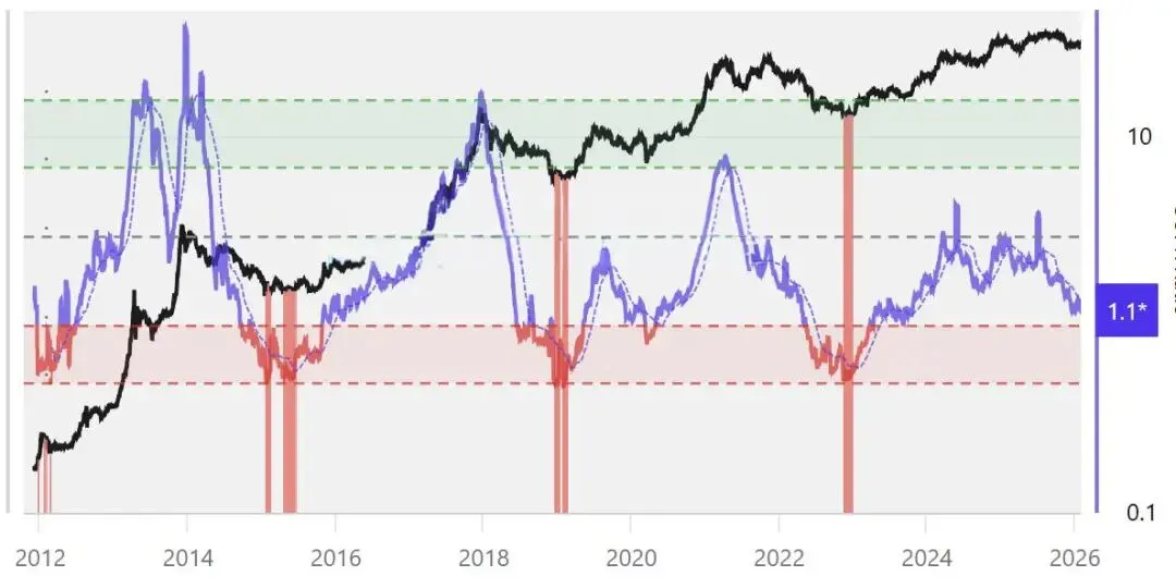 到了1以下,进入熊市中期的后半段并逐渐过渡到熊市晚期;到了0.5附近熊市晚期结束,熊转牛;出现预警之后,熊市确认结束,牛市确认到来!