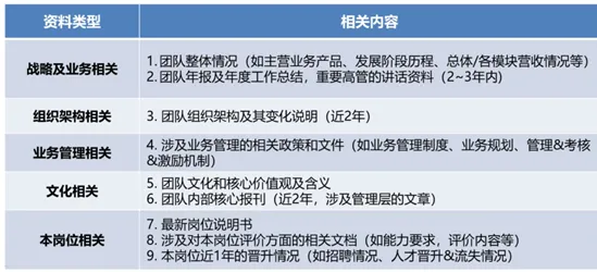 想要“定标准”,阅读资料的功夫不能少。在阅读时,可以从战略&业务、组织架构、业务管理、文化、岗位等维度出发,资料不同,关注侧重点也各不相同。