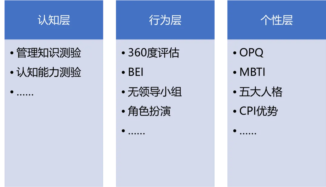 在选择工具环节,首选适合企业内部测评使用的测评工具。常用的测评工具主要分为认知层、行为层和个性层三个层面。