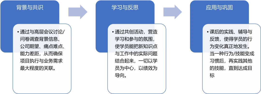 内容安排:访谈与项目准备、启动会与首次研修、课后行动实践、二次研修、行动学习、三次研修、行动学习、四次研修及结营。