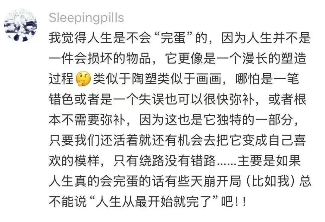 而且现在我越来越觉得,人生就那点事儿,过去的每一天就消散了,你说人生的转运是累积的,可能也是吧,但很多时候好运厄运都是嘎嘣一下就那样了,所以前面的每一天都放过自己得了,能在舒适区过就别为难自己了,社会意义上的看起来你过得好是一回事儿,而对于你自己来说,这一天你想怎么混过去只要你觉得舒心爱咋混过去咋混过去,混过去一天算一天!