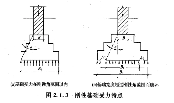 ②刚性基础中压力分布角α称为刚性角。在设计中,应尽力使基础大放脚与基础材料的刚性角相一致,以确保基础底面不产生拉应力,最大限度地节约基础材料。构造上通过限制刚性基础宽高比来满足刚性角的要求。