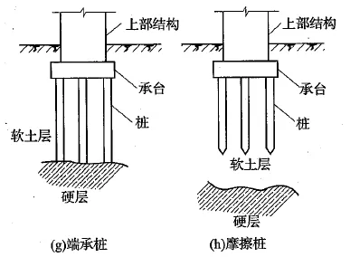 1) 端承桩:桩打到硬土层上,靠桩端的反支撑力来支撑上部结构。